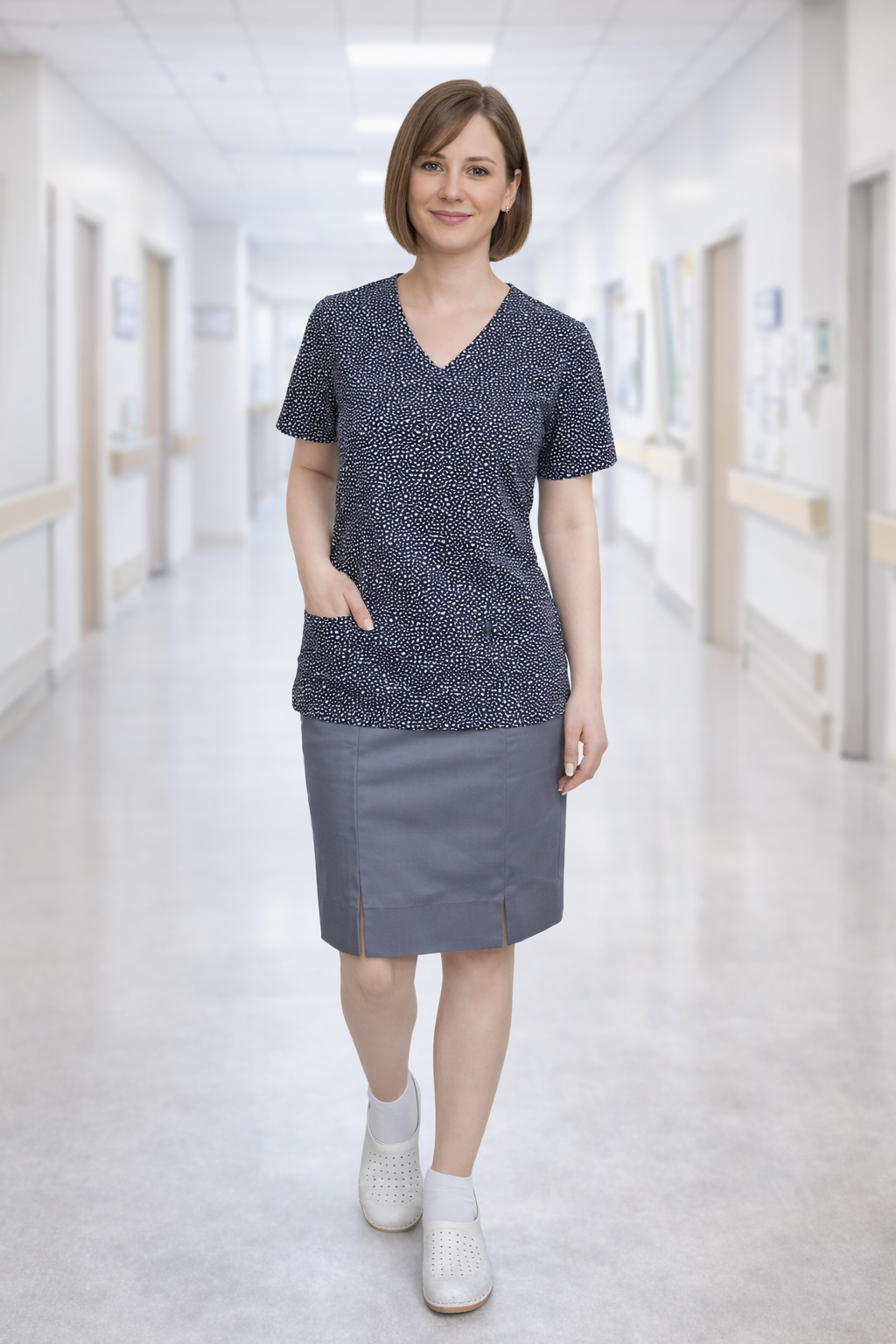 Materiał: Oddychająca tkanina o wysokiej przepuszczalności powietrza, dzięki czemu spódnica doskonale sprawdza się podczas długich godzin pracy w szpitalach, przychodniach i innych placówkach medycznych. Praktyczny i wygodny krój: