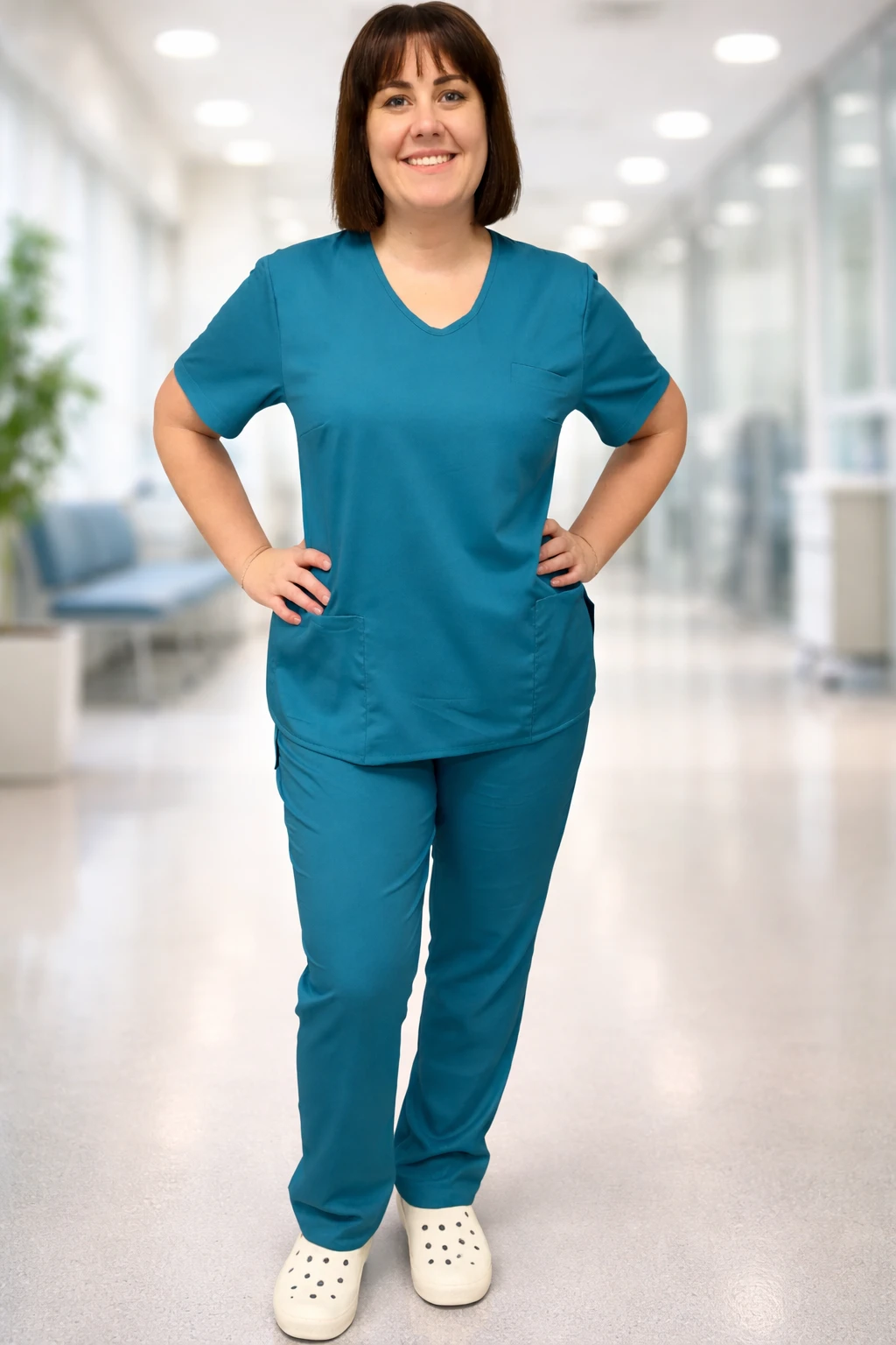 Skrubsy z wiskozy wyróżniają się przede wszystkim miękkością i komfortem noszenia – materiał jest przyjemny w dotyku i nie podrażnia skóry, nawet przy długich dyżurach.