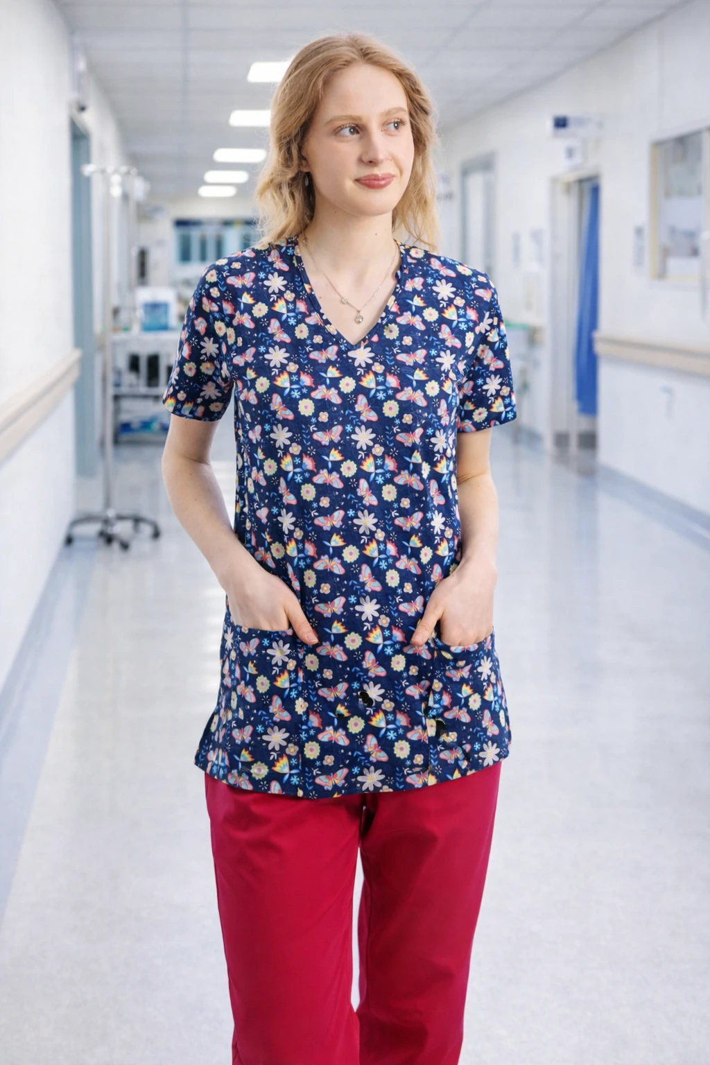Bluza medyczna w wzorze „motyle na granacie” to subtelne połączenie elegancji z lekkością i kobiecym charakterem — idealne dla pielęgniarki, która chce wyglądać profesjonalnie, ale jednocześnie przyjaźnie i stylowo.