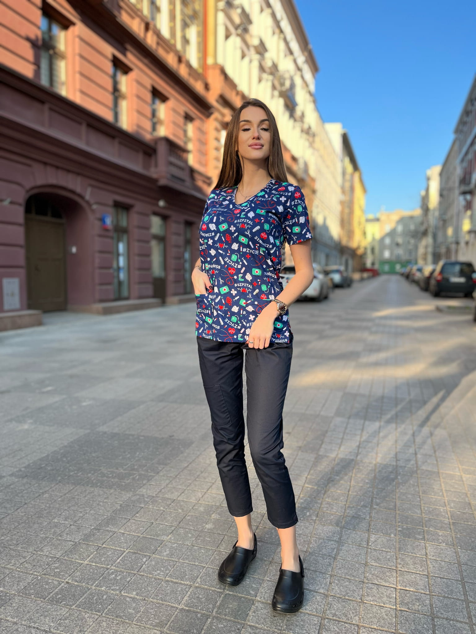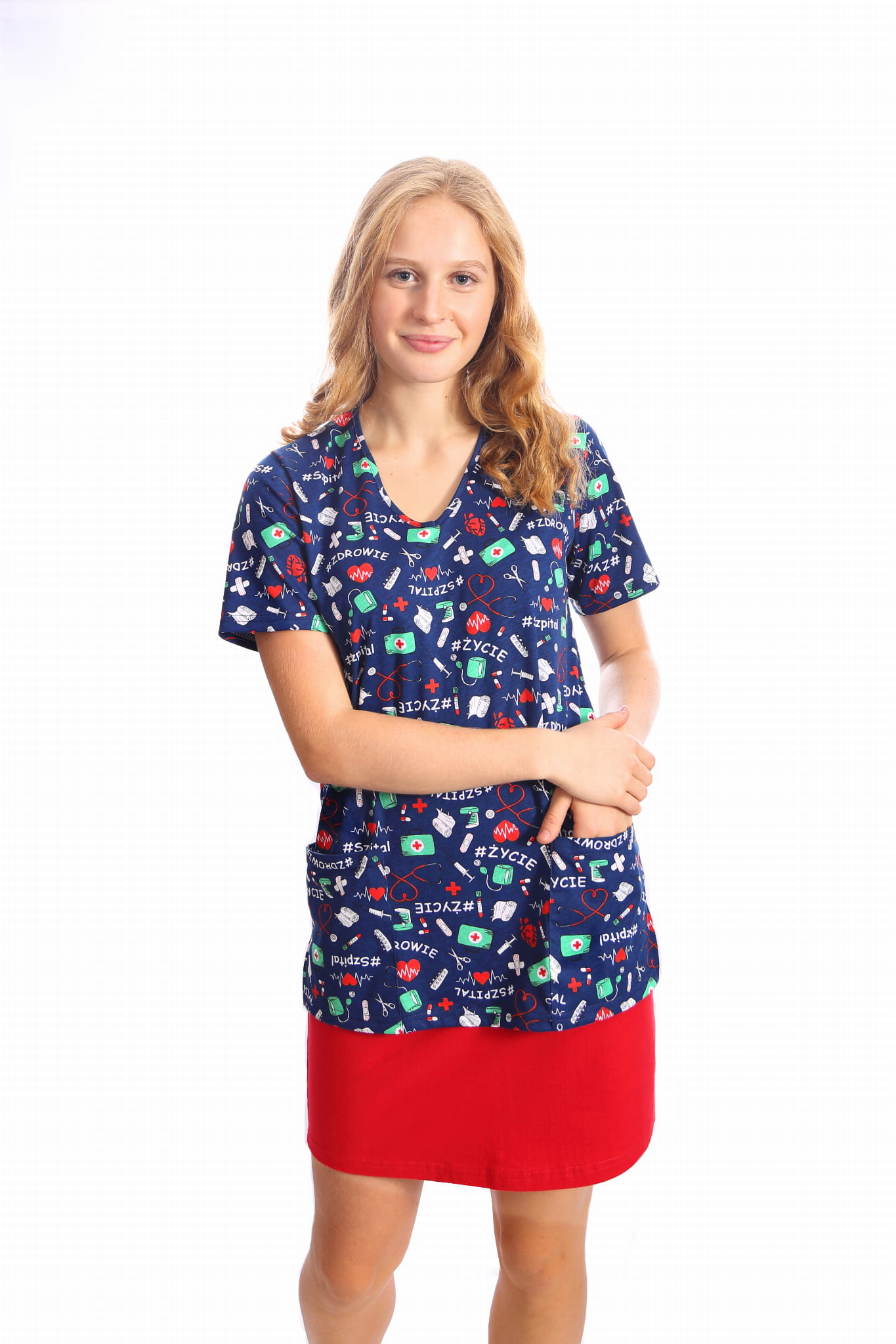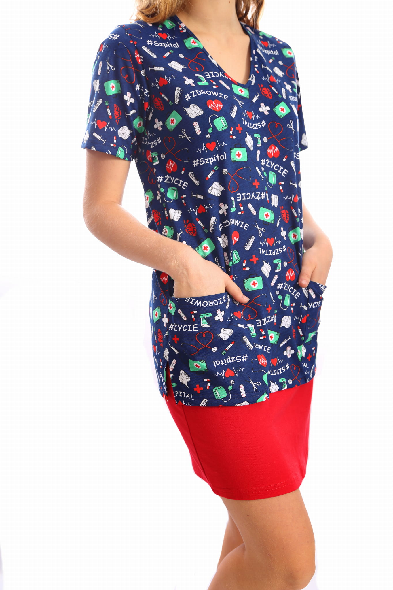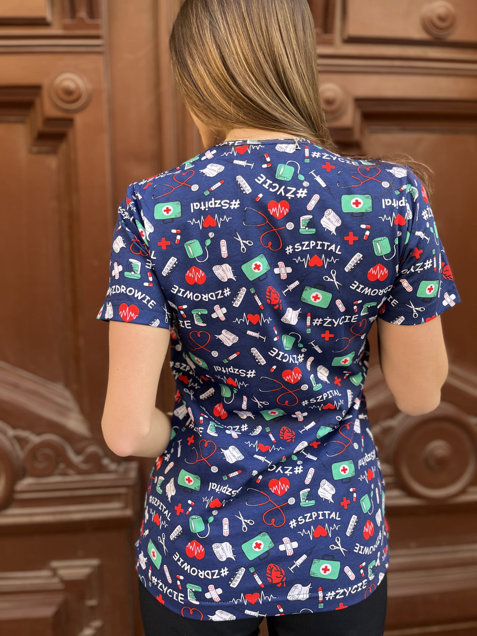 Motywy takie jak stetoskopy, serca, symbole medyczne i napisy tworzą energiczną, przyjazną kompozycję, która przełamuje klasyczną monotonię uniformu.