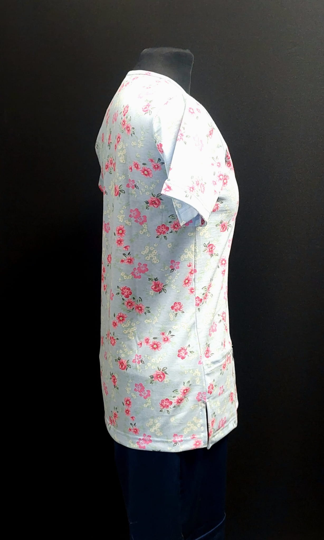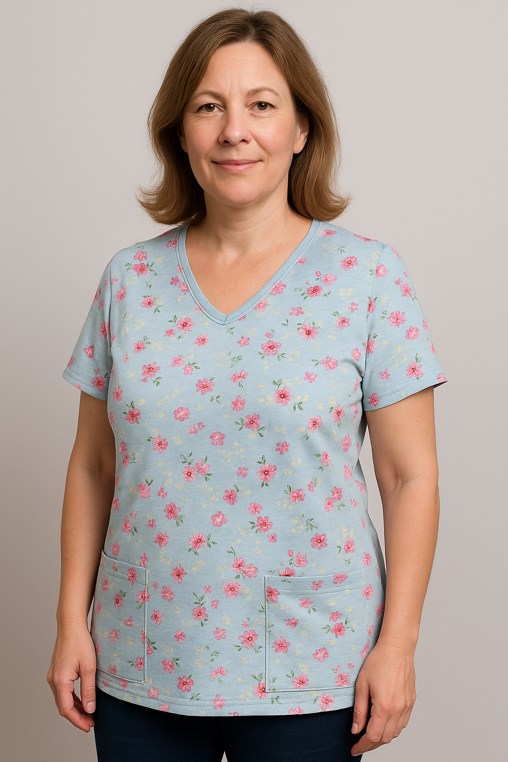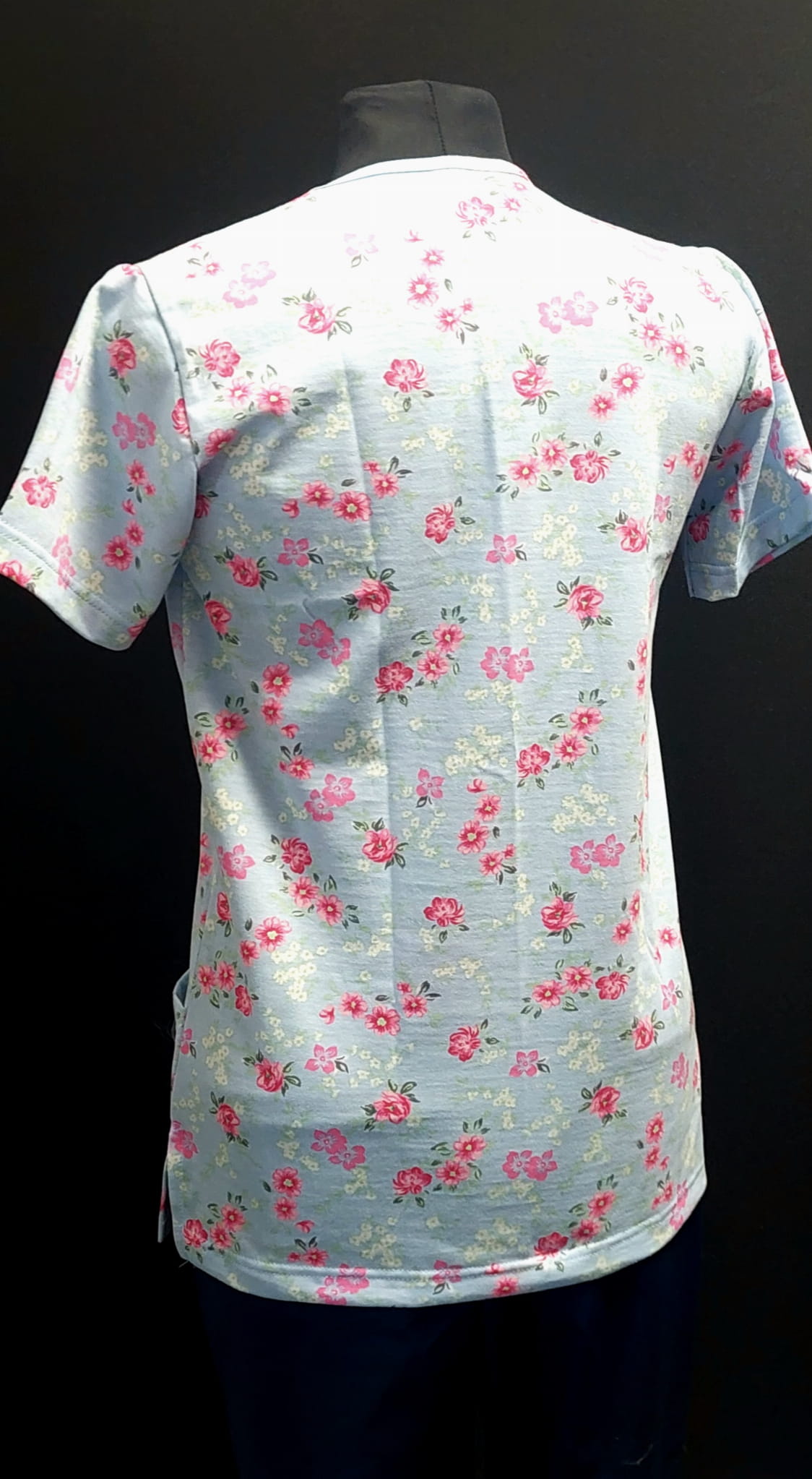 Kwiatki na błękicie to delikatny, pogodny wzór idealny dla pielęgniarki, która chce połączyć profesjonalizm z subtelną kobiecością. Jasnoniebieskie tło z drobnym, różowym motywem kwiatowym nadaje uniformowi świeżości i ciepła