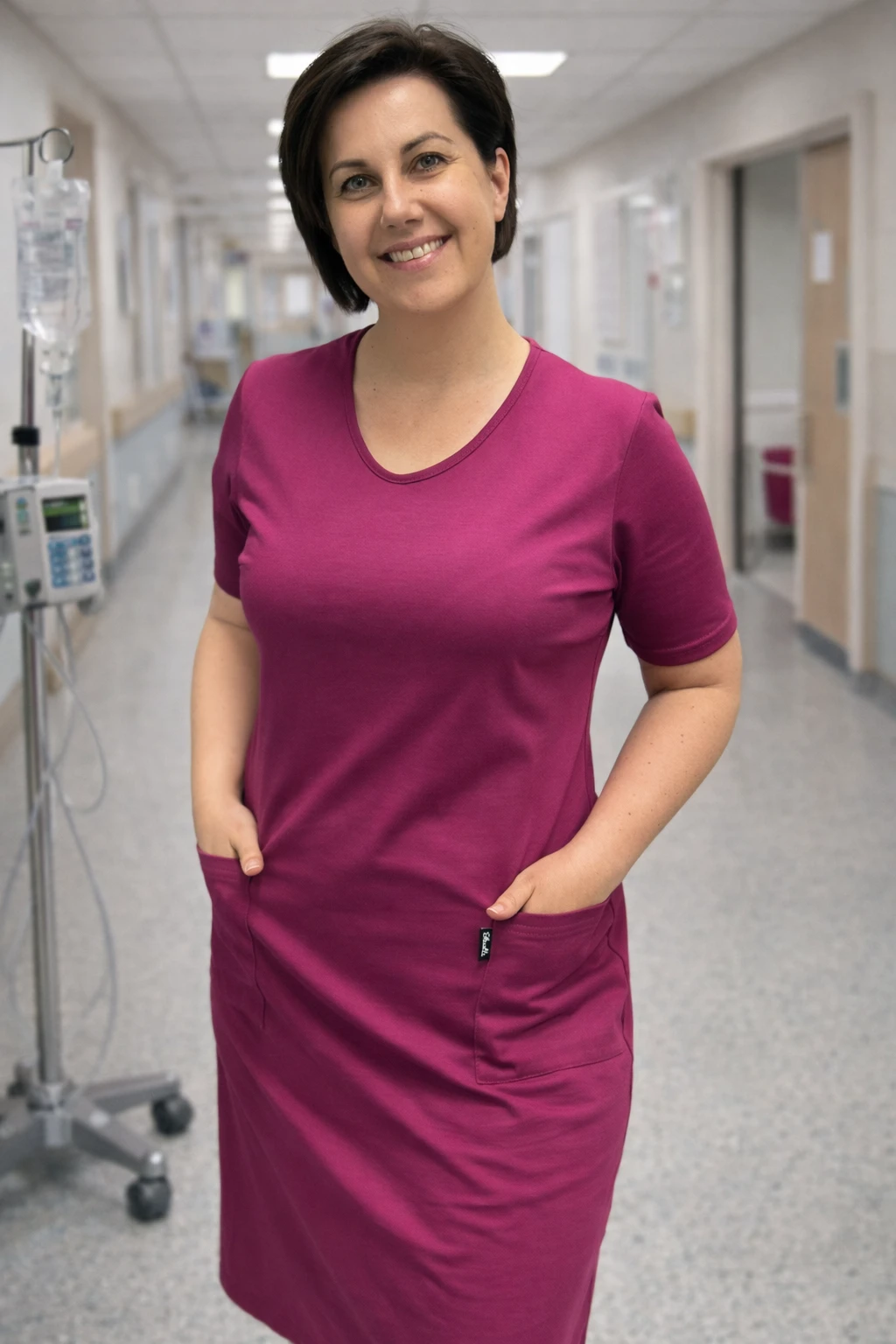- Praktyczna długość: Sukienka sięga do kolan (przy wzroście ok. 165–170 cm), gwarantując komfort przy schylaniu i kucaniu.